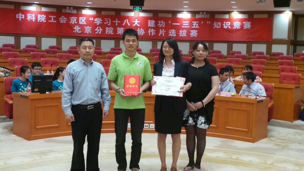 为庆祝十八大的成功召开,切实响应院党委关于学习十八大精神的号召。2013年5月24日上午,中科院工会京区“学习十八大,建功‘一三五’”知识竞赛北京分院第二协作片选拔赛在科技会堂举行,共有10家单位组队参加了比赛。声学所代表队凭借出色的发挥以230分的总成绩获得了并列第一名,将与国家图书馆代表队共同代表北京分院参加全院十八大党史知识竞赛。