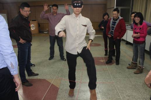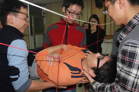 接下来大家参加了体验式培训活动。体验师对活动的性质进行了生动地讲解,通过“拍掌”热身运动对事情完成做了各要素分析,带领大家激情饱满地进入了正式的体验活动中。全体活动人员平均分成三队,在经历了半个小时的紧张训练后,“小鸡炖蘑菇”队第一个上场,作为第一个吃螃蟹的人,他们在第一环节“拦网送人”中屡屡出错,成绩不够理想,但全体队员齐心协力,认真总结经验和不足,并及时调整心态,在接下来的“沼泽”、“送球入洞”、“不倒森林”、“我们是最棒的”环节中都比较顺利地通过。接下来的“梦三队”和“集思广益队”,通过对前面小组比赛的认真观察,两队都很快找到竞赛的技巧和方向,取得了良好的成绩。通过一轮的比赛之后,各队认真分析了自己比赛中的不足,总结了他人的优点,结合自身及时调整,在重复比赛中各队的成绩均有了很大提高。