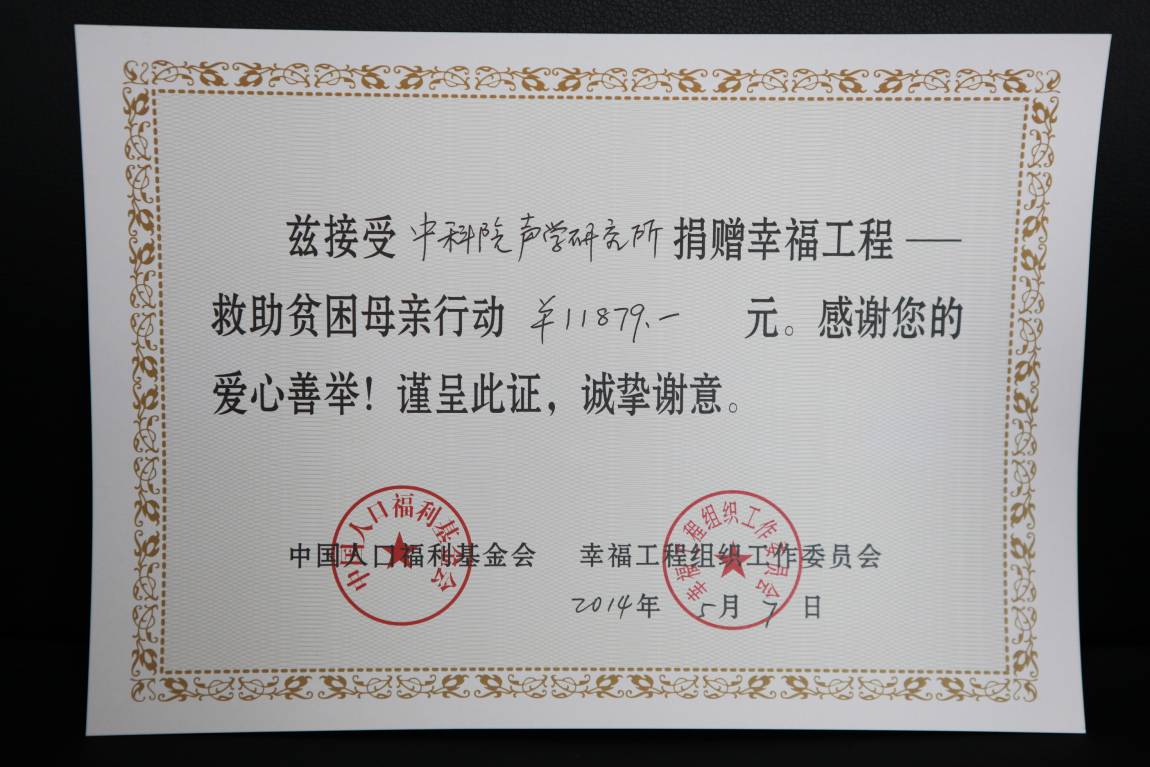 1995年初,中国人口福利基金会、中国计划生育协会和中国人口报社共同发起实施幸福工程——救助贫困母亲行动。2014年4月,中科院声学所积极响应北京分院的号召,在全所范围内开展了为贫困母亲捐款的活动。