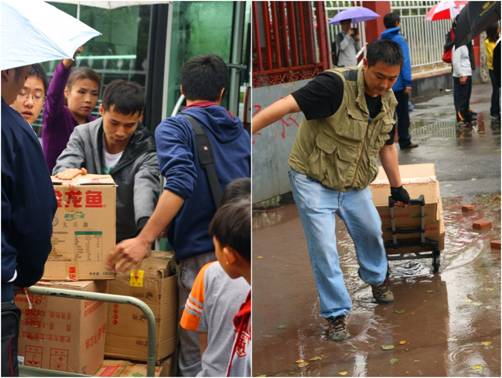 活动当天天气不佳,但参加活动的人均提前到达指定地点,于早上9点准时从声学所发车。经过一个多小时的车程,于10点准时到达光爱学校。见到声学所的叔叔阿姨哥哥姐姐前来,孩子们十分高兴,主动上前帮忙,和声学所师生一起冒雨搬运慰问物品。