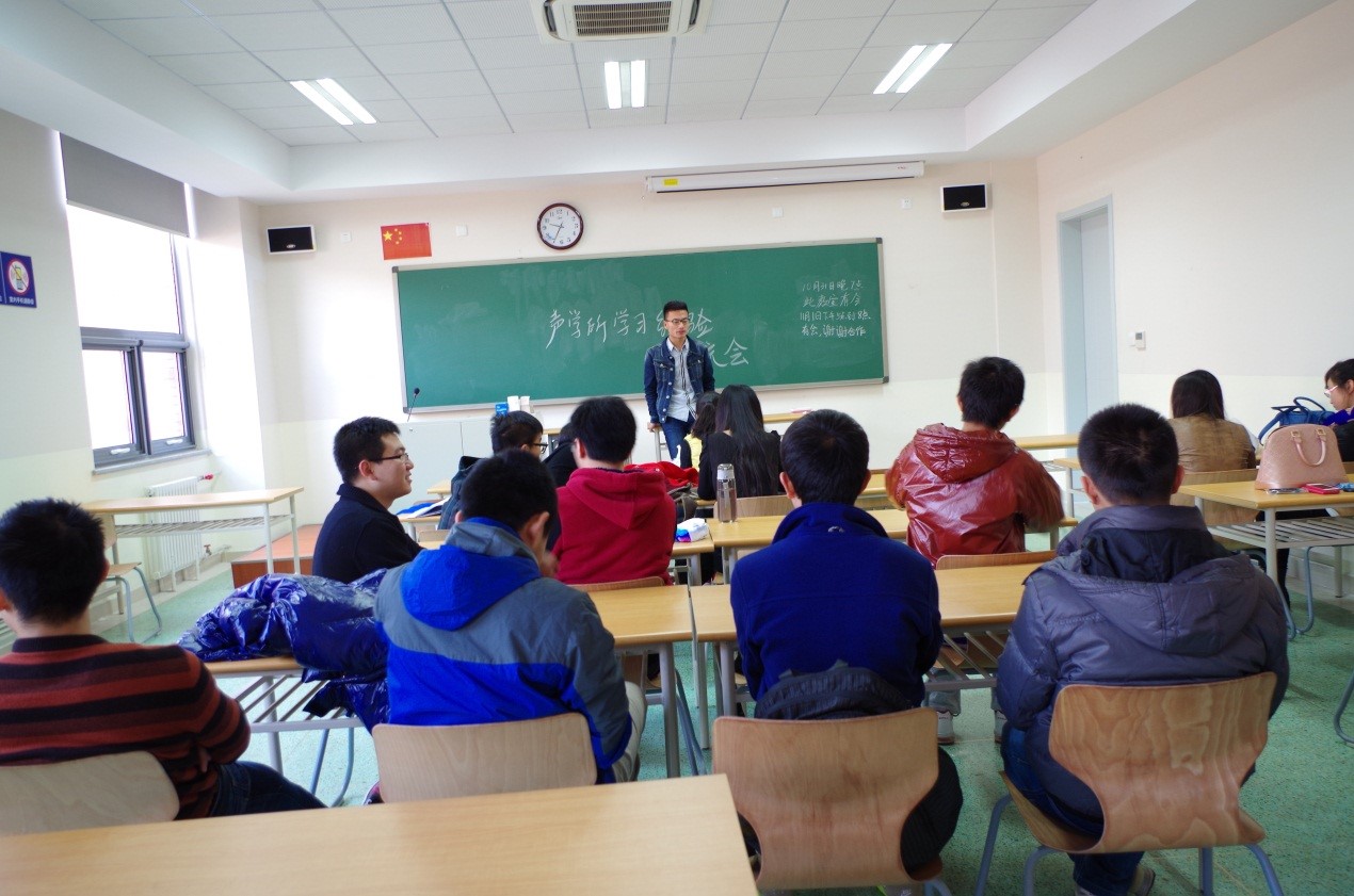 2014年11月1日,为帮助研一新生更好的融入学习环境,备战即将到来的考试周,声学所研究生会代表全体同学来到国科大雁栖湖校区,举行新老生学习经验交流会。交流会由研究生会学术部部长薛凤杰主持。