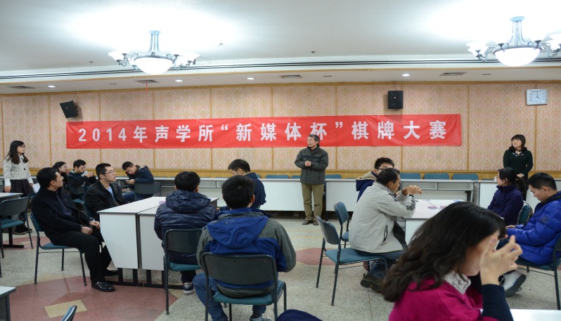 2014年12月2日,由声学所工会、声学所团委主办,国家网络新媒体工程技术研究中心赞助,声学所棋牌协会承办的一年一度的 “新媒体杯”棋牌赛在声学所DSP多功能厅隆重开幕。“新媒体杯”棋牌大赛为我所传统活动,旨在活跃声学所广大职工与学生的业余生活。通过本次比赛希望选手们在繁忙的科研之余劳逸结合,增进交流,缓解工作压力,提高科研效率。本届棋牌大赛分为升级大赛和三国杀挑战赛,我所职工和研究生参与积极,共有41支队伍,96人参加比赛。其中升级比赛设在DSP多功能厅,有27支参赛队伍,三国杀挑战赛设在北二楼活动室,共14支参赛队伍。