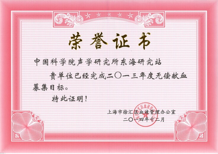 近日,上海市徐汇区血液管理办公室传来喜讯,中科院声学所东海研究站获得“徐汇区完成2013年度无偿献血募集目标”荣誉证书。该荣誉是对东海站献血工作成绩的认可,也是对东海站职工、研究生积极弘扬无私奉献精神的鼓励。