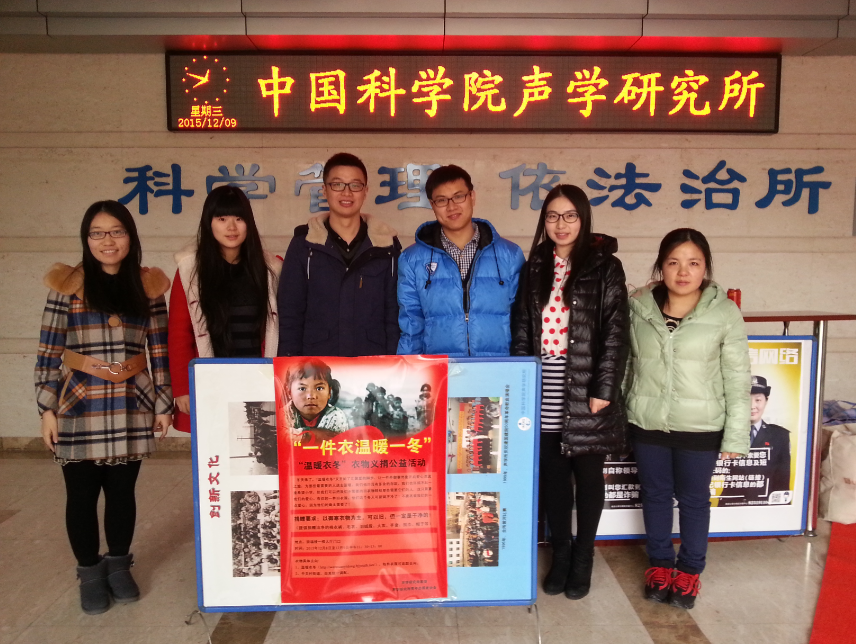 2015年12月8日至9日,为了响应北京市“温暖衣冬”专项活动,由声学所团委发起、青年志愿者协会承办举行了“一件衣温暖一冬”的声学所衣物义捐活动。本次活动旨在弘扬勤俭节约,互助互爱的优良传统,让闲置衣物重现价值,将他们送给那些最需要的人们。