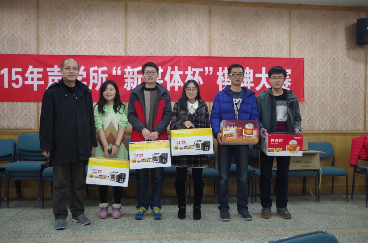 最后进行的是本次比赛的颁奖仪式。颁奖仪式上,张春华书记、周秀霞副主席、邓浩江副主任分别为获得一、二、三等奖的选手颁奖。所领导对各位选手取得的优异成绩表示祝贺,并感谢网络新媒体实验室对本次比赛的大力支持和棋牌协会的有序组织。至此,声学所2015年“新媒体杯”棋牌大赛圆满结束。
