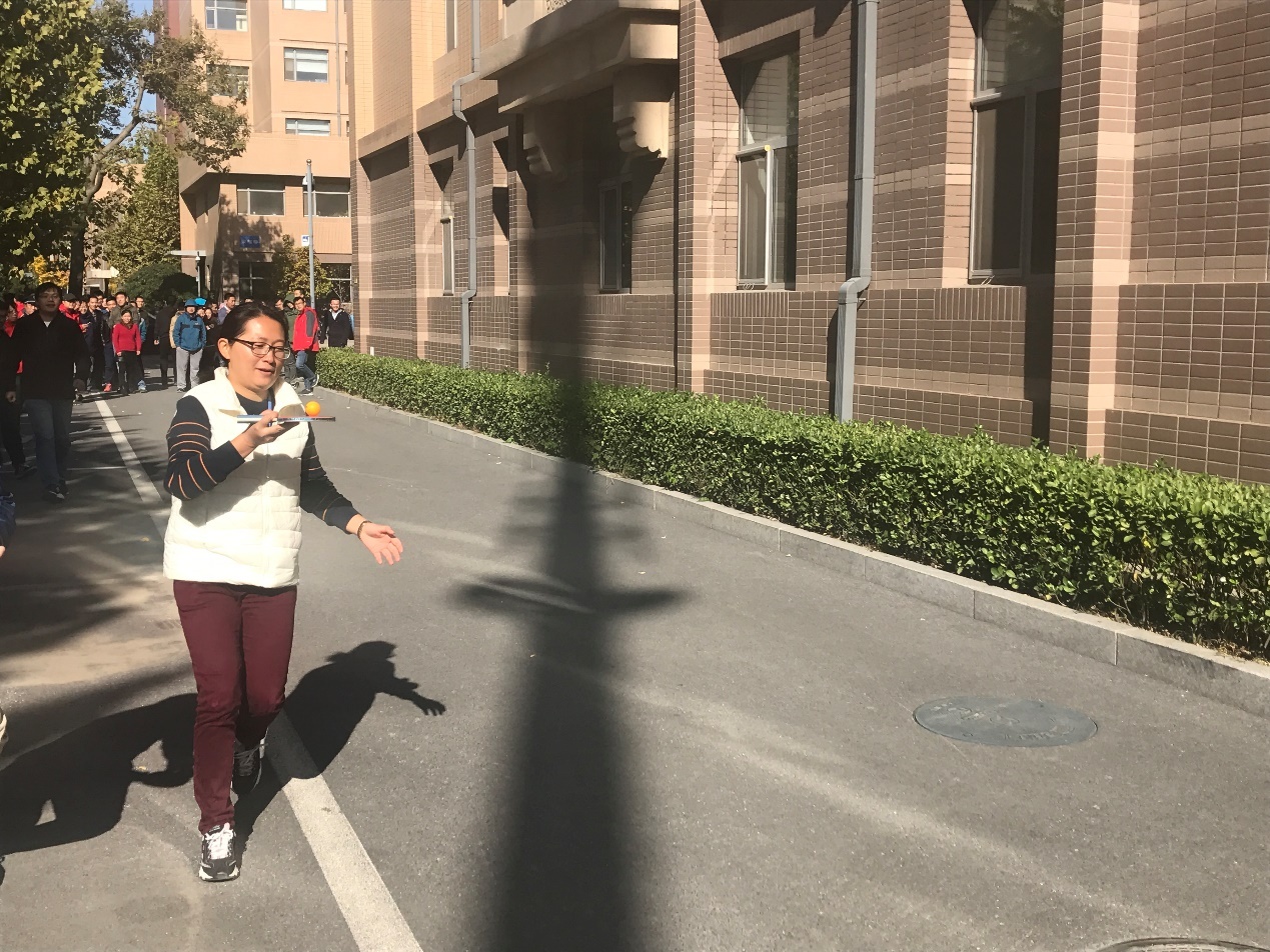 最后一场比赛是最为紧张刺激的托球跑接力赛,因为这是一项团体项目,每个参赛运动员都十分认真专注。运动员们用乒乓球拍托着乒乓球快速跑动,乒乓球在球拍上每一次转动都会引起观众们一声声惊呼,每一位运动员成功返回都会引来一阵阵喝彩。比赛刚一开始,网络新媒体的宋磊老师就迫不及待地托着球往前跑,但是由于比赛当天风比较大,乒乓球一不小心就掉了,宋磊侧向一个箭步俯身捡球,再立刻回到丢球的地方出发,这套动作一气呵成干净利落,他凭借敏锐的身手竟然也不落后别人多少。要说速度最快还是经常健身的脱立恒老师,他依靠自己良好的平衡能力和肌肉控制力,平稳快速地完成了自己这一段,为比赛奠定了优势局面。