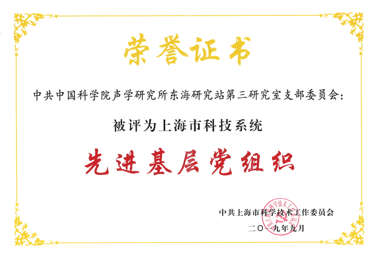2019年9月24日下午,为喜迎新中国成立70华诞,上海市系统在科学会堂举行 “礼赞新中国,科创争先锋”庆祝中华人民共和国成立70周年主题交流会。会上中国科学院声学研究所东海研究站作为新晋上海市文明单位被授予上海市“文明单位”奖牌。东海研究站第三党支部被授予上海市科技系统“先进基层党组织”称号,景永刚同志被授予上海市科技系统“优秀共产党员” 称号,黄楚丹同志被授予2017-2018年度上海市科技系统文明创建“优秀组织者”称号。
