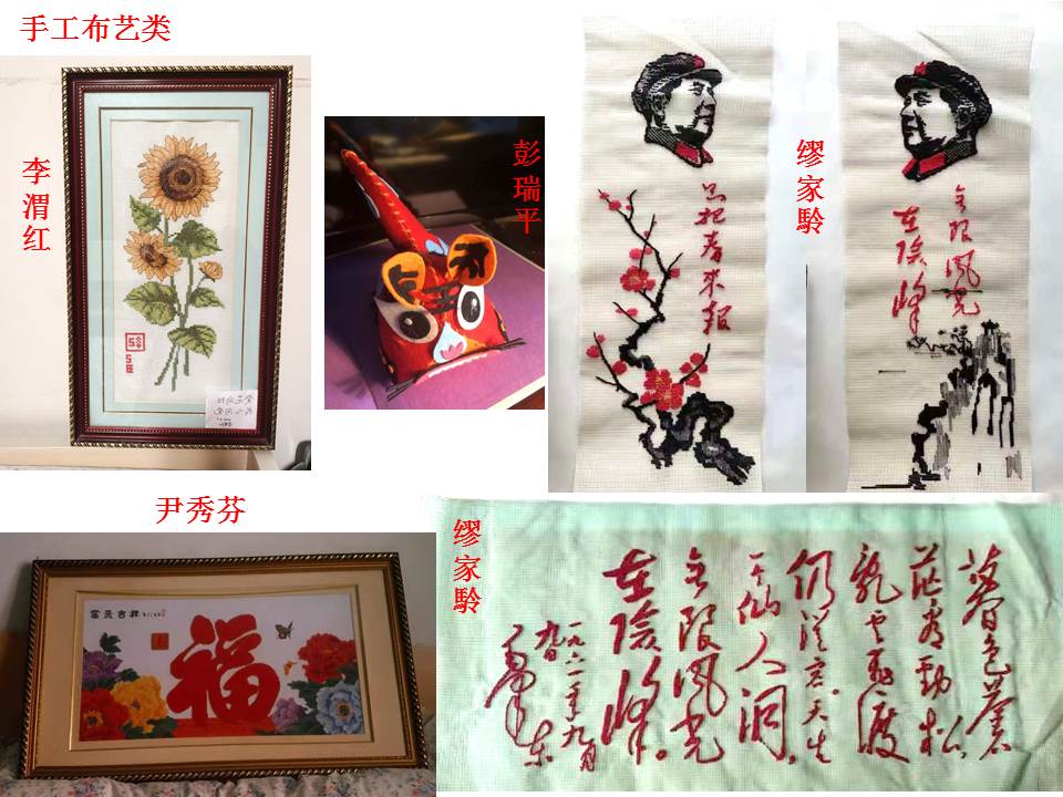 李渭红、彭瑞平、缪家駖、尹秀芬、郑敏老师通过刺绣和手工带来了布艺作品。
