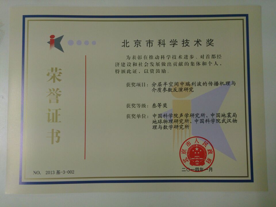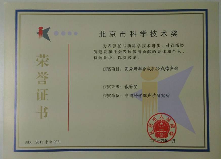 2014年3月25日,北京市科学技术奖励大会在京召开,会上宣布了2013年度北京市科学技术奖获奖名单。2013年度北京市科学技术奖共有233项。其中一等奖26项,二等奖66项,三等奖141项。由我所综合声纳技术实验室研发的“高分辨率合成孔径成像声纳”荣获二等奖,声学微机电系统实验室牵头完成的“分层半空间中瑞利波的传播机理与介质参数反演研究”荣获三等奖。在此,让我们向他们表示热烈的祝贺!