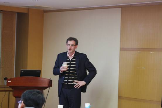 学术报告以“Why does poroelasticity matters?”开始,Tobias Muller 博士介绍了研究孔隙弹性介质中波传播的意义,并介绍了常用的理论模型。之后,他介绍了在裂隙存在的情况下,P波和S波的分裂,以及其形成的不同物理意义,指出这是Biot模型方程的扩展。除此之外,他重点介绍了裂隙的连通比例对弹性波衰减因子Q的影响,给出了详尽的模拟结果和分析。报告引起了与会者的广泛兴趣,大家在报告结束后进行了热烈的讨论。
