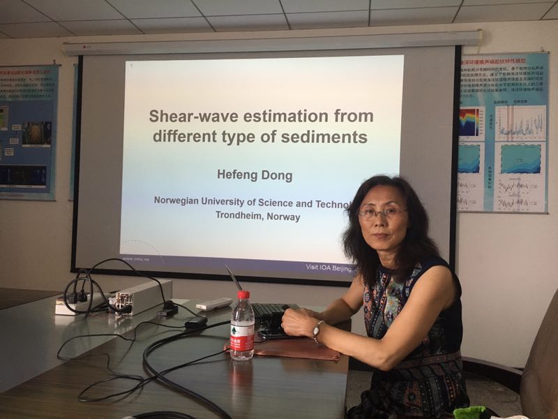 2017年7月21日,应中国科学院水声环境特性重点实验室邀请,挪威科学技术大学董和风教授来到声学所进行学术交流访问。董教授首先向大家简要介绍了挪威科学技术大学在科研和学生培养情况、并作了题为“Shear-wave estimation from different type of sediments”的学术报告。报告介绍了董教授在利用表面波频散特性反演地层横波速度剖面方面的最新成果。报告之后,双方就对未来可能合作的研究方向进行了深入探讨。此次报告由吴金荣研究员主持,曾娟副主任及近三十个学者和学生参加了此次报告会。