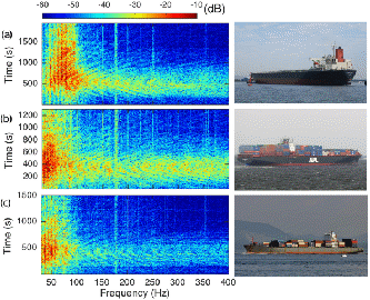 在该实验中,28个水听器组成孔径77 m的传感器阵,用来记录进入或离开洛杉矶港口的水下航船噪声。三个时间段内三艘不同航船产生的噪声数据(航船噪声谱见下图),作为机器学习分类模型的训练数据和测试数据。
