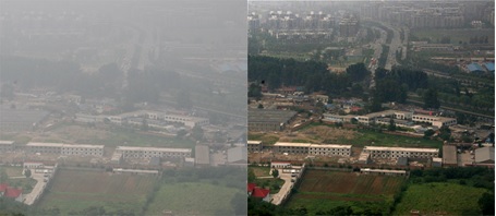 采用图像引导滤波去雾算法结果(左:去雾前;右:去雾后)
