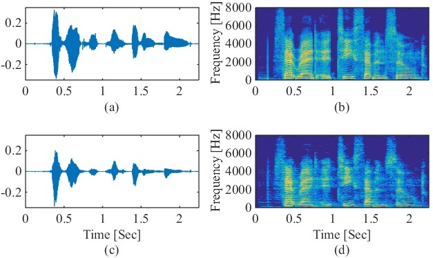 纯净语音和采用引导语谱滤波去噪去混响方法处理结果的时域图和语谱图
