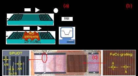 图1 (a)声表面波磁场传感器的基本结构,(b)传感器件响应,(c)沉积栅阵化铁钴薄膜的传感器件