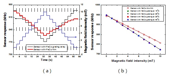 目前,人们已研制出利用各种物理、化学和生物效应的磁场传感器,并已在科研、生产和社会生活的各个方面得到广泛应用,承担起探究种种信息的任务。但是多数的磁场传感技术在灵敏度及磁滞误差等方面仍存在问题,阻碍了其实质应用。将栅阵式铁钴(FeCo)磁致伸缩薄膜高磁敏、低磁滞性与声表面波的快速响应特点相结合,有可能实现一种快速、高灵敏、低迟滞误差、稳定可靠的新型磁场检测方法来检测磁场。