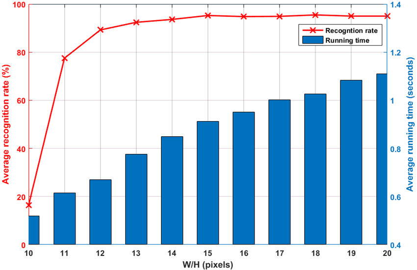 实验结果表明,新的识别模型在图像分辨率极低的情况下(13 x 13 pixels),对单波段掌纹图像特征的识别率可以达到90%以上(图2),具有很好的可靠性。结合多波段数据融合技术,整体识别率可以达到99.9%以上。经并行优化后,每0.73 毫秒可以识别一个掌纹(1000毫秒=1秒),具有精度高、运算量小、可并行度高等多项优点。