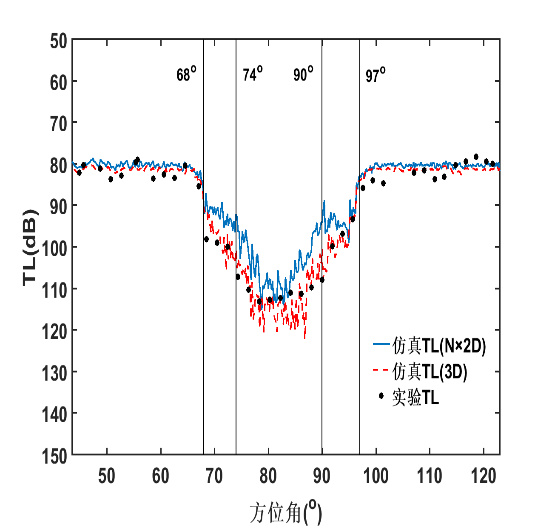 图2. 海底山后方45°-122°方位角范围内的传播损失实验结果与理论计算结果比较(图/中科院声学所)