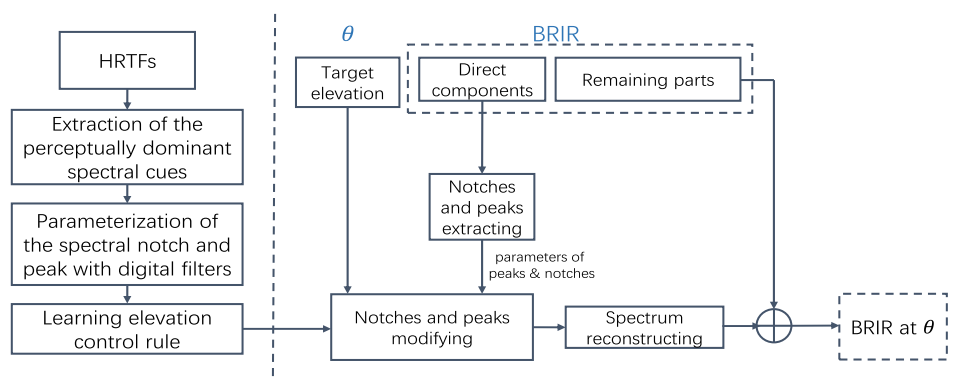 研究人员将所提仰角参数化控制方法应用于双耳房间冲击响应(Binaural Room Impulse Response, BRIR),依据优先效应对水平面BRIR进行频谱修改(图1),并通过主观测听实验验证仰角定位效果。
