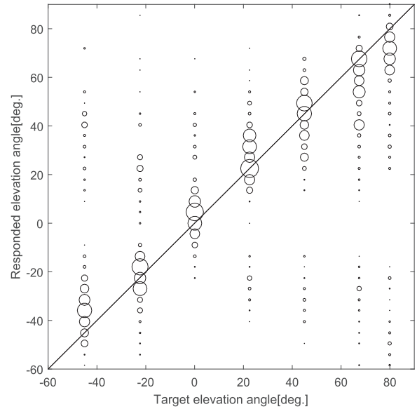 实验结果(图2)表明,响应沿对角线分布,表明响应方向与真实方向相一致,该研究方法能较好地实现重放声源的仰角控制。