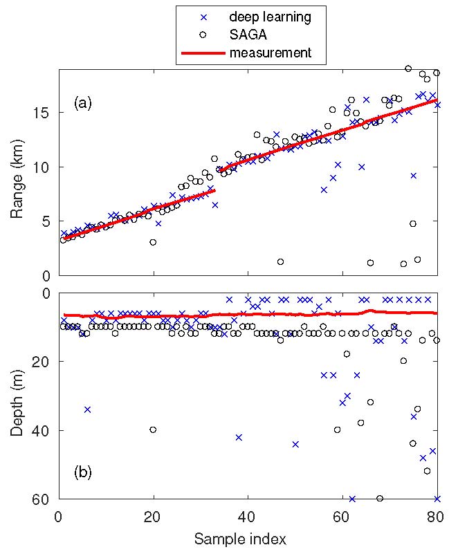 近期,中科院声学所的牛海强等人与美国Scripps海洋研究所的研究人员联合提出一种适用于不确知海洋环境的基于深度学习的水声被动定位方法。该方法利用声场传播模型生成的上千万个训练样本,对一组50层的深度残差卷积神经网络进行训练,实现了单水听器对单个声源的远程被动定位。相关研究成果2019年7月在线发表于国际学术期刊Journal of the Acoustical Society of America。