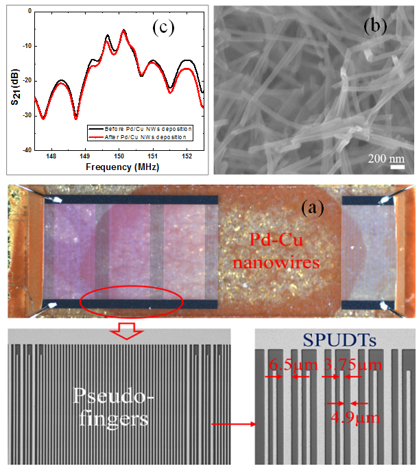为应对这一难题,中科院声学所王文团队与南开大学杨大驰团队合作,将微纳声表面波器件技术与快速响应的钯铜纳米线氢敏材料相结合,提出并研制了一种秒级响应的新型声表面波氢敏器件。纳米线形态的钯铜氢敏材料具有极高的吸附面积,由此大幅增加了氢敏效率,从而提高传感器响应速度与灵敏度。