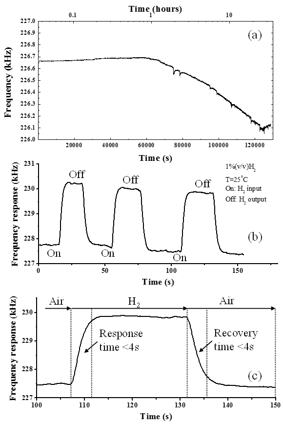 研究人员利用电化学沉积方法合成的钯铜纳米线(图1)滴涂制备于传感器件表面声表面波传播路径表面,构建出了小尺度声表面波氢敏器件(图2)。结合差分振荡结构的传感电路,对所研制的声表面波氢敏器件进行了测试评价(图3),相对于国内外已报道氢敏元件,传感器实现了快速的传感响应(<4s),此外还具有低检测限(7ppm)、良好选择性和重复性的特点,其灵敏度达1.5kHz/%,在氢能应用中具有很好的应用前景。