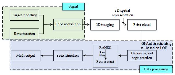 该项研究对浅水强混响环境下的目标进行了回波仿真和三维成像,分析了混响给三维成像带来的影响;并针对环境干扰带来的噪点和异常点,提出一种基于局部异常因子(LOF, Local Outlier Factor)的全局迭代阈值分割方法,首次将数据挖掘的思想应用于三维成像声纳信号处理中,有效地在保持目标特征的前提下去除干扰信息;另外提出了一种基于随机采样一致性(RANSC, Random Sample Consensus)的Power Crust重建算法,提高了目标重建的视觉效果。