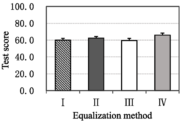 客观指标表明,相比于幅度均衡,相位均衡对耳机瞬态响应的影响更大,尤其当系统相位为线性时,瞬态响应衰减更快。图中表示四种方法均衡后的主观测听效果。四种方法分别为幅度相位不均衡(I)、幅度相位同时均衡(II)、只均衡幅度(III)、只均衡相位(IV)。主观评价实验结果表明,线性相位对耳机重放音色的提升显著,而以平直幅频响应为目标的幅度均衡对耳机重放音色提升有限。因此,耳机均衡时不仅需要设计合适的幅频响应目标,还要考虑相位均衡对耳机重放的影响。