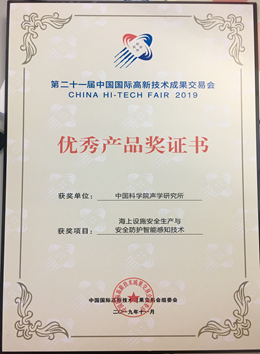 2019年11月13日,素有“中国科技第一展”之称的第二十一届中国国际高新技术成果交易会(高交会)在深圳会展中心拉开帷幕。本次高交会为期5天,中国科学院率33家机构将350余项高科技成果于5号馆集中展示。声学所海洋声学技术中心的“海上设施安全生产与安全防护智能感知技术”项目参展并获得高交会优秀产品奖。