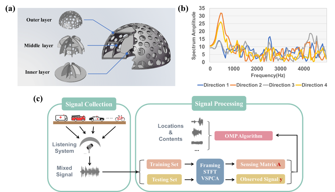 受生物听音机制的启发,中科院噪声与振动重点实验室的博士生孙雪聪与其导师杨军研究员、贾晗研究员提出了一种基于声学超材料的单通道多声源的定位与分离系统,用一个带有超材料外壳的单通道麦克风实现了三维空间中多个同时发声声源的实时定位与分离。