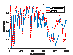 在管道泄漏点左右两侧分别安装线圈传感器和B&K 8103水听器,采集泄漏声信号并进行频域分析,其相干系数及相位谱如图3所示。对比可见,线圈传感器测试信号在低频域(1 kHz内)具有良好的相关性和相位线性关系,并与水听器测试结果基本一致。分析线圈传感器与水听器结果的相位谱得到的漏点定位误差在2%以内。