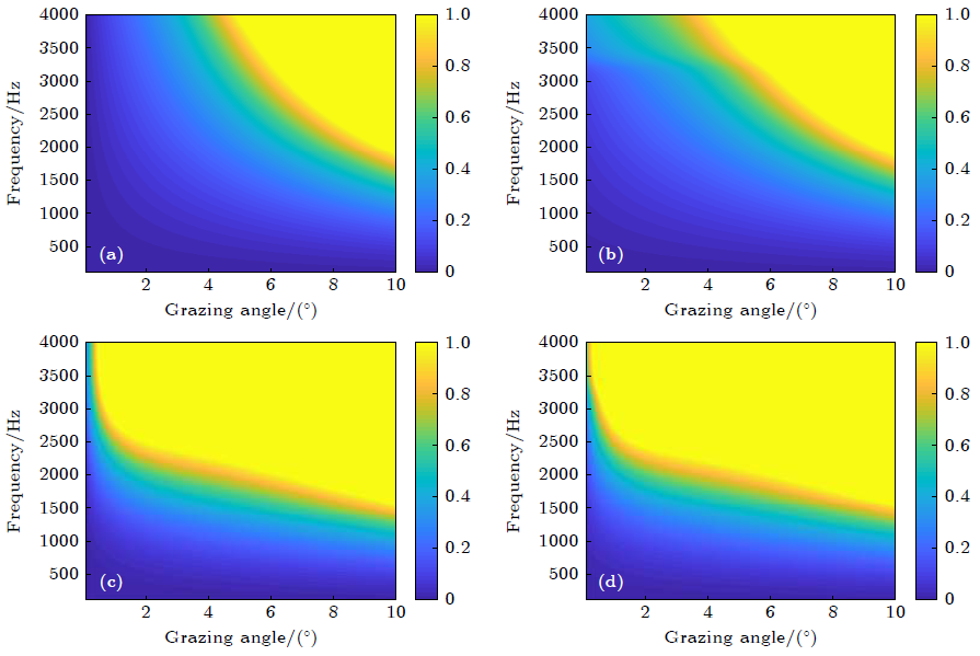 图2 风速为13 m/s 时起伏海面以及气泡层对海面反射损失的影响:(a) 无气泡层;(b) 考虑气泡层对声波的消减效应;(c) 考虑气泡层对声波的折射效应;(d) 同时考虑气泡层对声波的折射效应和消减效应(图/中科院声学所)