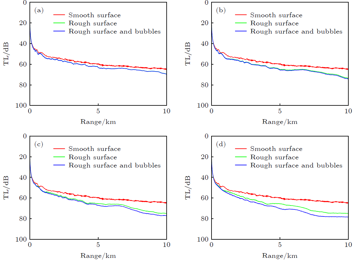图1 风速为10 m/s 时起伏海面以及气泡层对海面反射损失的影响:(a) 无气泡层;(b) 考虑气泡层对声波的消减效应;(c) 考虑气泡层对声波的折射效应;(d) 同时考虑气泡层对声波的折射效应和消减效应(图/中科院声学所)