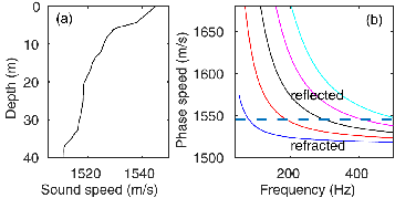 图1 (a)负梯度海水声速剖面; (b)对应的前5阶模态的相速度(图/中科院声学所)