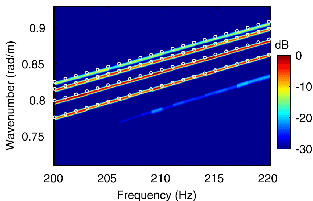 对于图1所示的典型夏季负梯度声速剖面,由块稀疏贝叶斯学习估计得到的频率-波数模糊度表面图及KRAKEN理论计算结果如图2所示。可以看出存在四个明显的峰值线,对应前四号简正波。峰值点的位置同样与理论计算结果一致,说明了该方法在负梯度水文环境下的有效性。