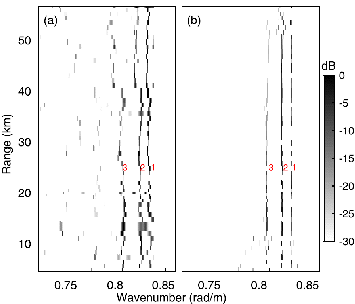 图 3 由块稀疏贝叶斯学习估计得到的4.4~56.6 km范围内的波数谱:(a) 实验数据; (b) 仿真数据(图/中科院声学所)