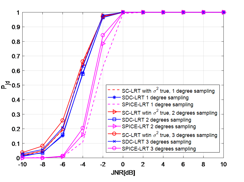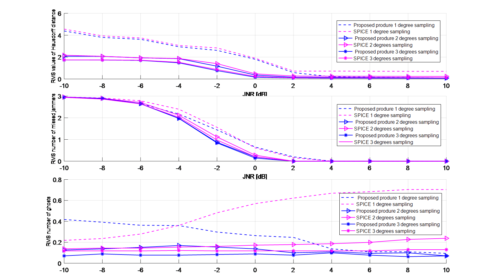研究结果显示,研究人员提出的SC-LRT和SDC-LRT比现有基于协方差矩阵估计的稀疏迭代似然比检测(sparse iterative covariance-based estimation likelihood ratio test, SPICE-LRT)具有更高的检测概率(图1)和更低的参数均方根 (root mean squared, RMS) 估计误差(图2)。此外,在1000次独立仿真试验中,SLIM方法在3种采样间隔下的NLJs数量估计准确度均达到了99%,而SPICE方法在2度和3度的网格采样率时估计准确度为93%以上(图3~图4)。