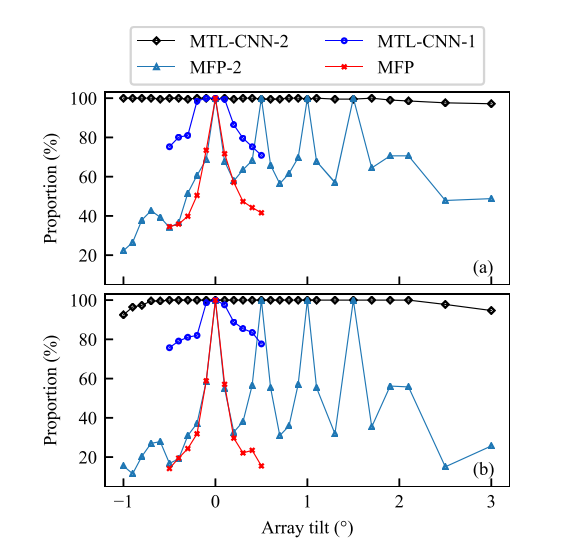 图1 不同方法对阵列倾斜的敏感性对比:(a)距离估计结果;(b)深度估计结果(图/中科院声学所)