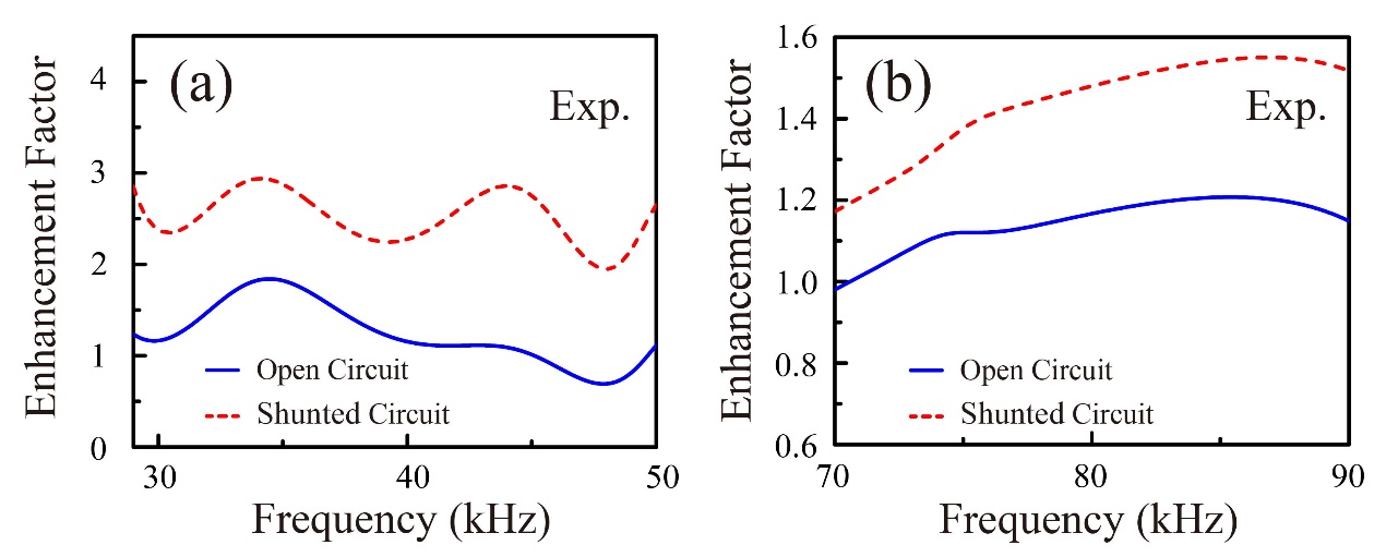 图2 可调式声学阻抗匹配层在插入钢/有机玻璃(左图)和钢/铝后的声能透射增强因子(右图)(图/中科院声学所)