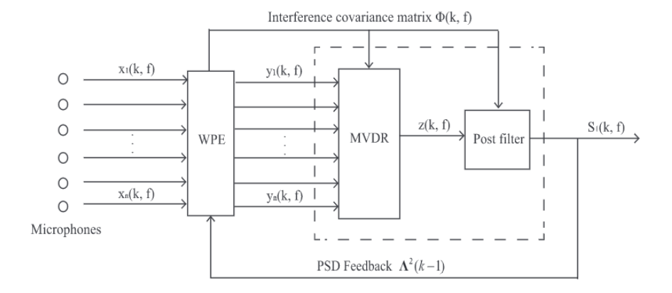 研究人员用加入单通道维纳后滤波的最小方差无失真响应(Minimum Variance Distortionless Response, MVDR)波束形成器实现了多通道维纳滤波器,其输入为加权预测误差(Weighted Predict Error, WPE)预处理器的输出信号。他们采用相对早期传递函数,而非整个相对传递函数或直达声信号,来实现MVDR波束形成器,并使用WPE的预测对干扰信号的协方差矩阵进行近似计算;随后根据整个系统的输出信号,来更新WPE中的目标信号方差。
