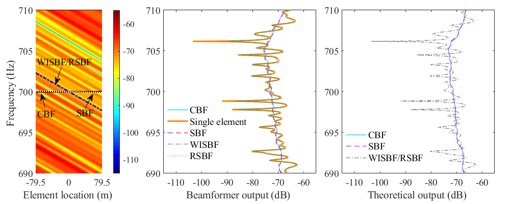 图1. 一个Pekeris波导下的仿真获得的不同波束形成方法的波束输出对比,波导水深105 m,声速1500 m/s,水平阵深60 m,孔径159 m,声源深度4 m,方位65°,不考虑环境噪声。可以看到WISBF/RSBF可获得比CBFSBF更高的处理增益和接近无失真的干涉条纹结构。(图/中科院声学所)