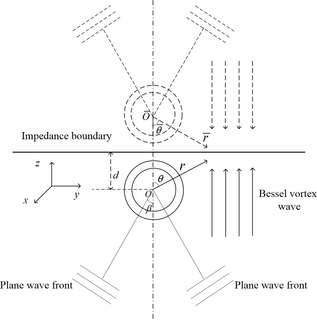 图1 Bessel涡旋声束入射到阻抗边界附近的粘弹性球壳示意图(图/中科院声学所)