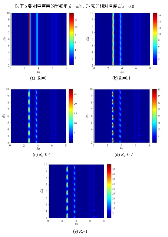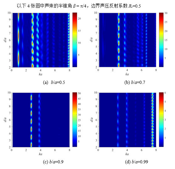 计算结果表明,随着边界声压反射系数的增大,声辐射力矩的峰值也随之增大,但峰值位置不变。事实上,这些峰值对应着球壳本身不同阶的本征模式。此外,边界的引入使在球壳与边界之间产生了准驻波场,声辐射力矩随球壳与边界距离的变化呈现周期变化的规律,其变化的周期与声波波长有关。