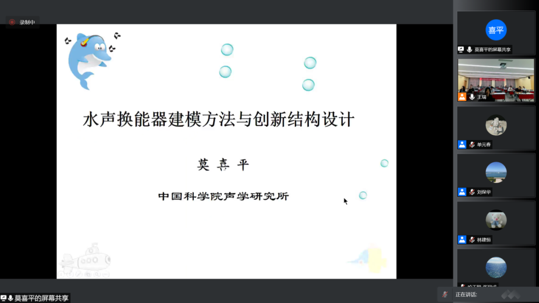 莫喜平研究员作《水声换能器建模方法与创新结构设计》的报告。报告从水声换能器能量转换与信息传递的任务功能出发,详细介绍了水声换能器基本物理参数体系和工程应用中的关注重点。同时,结合典型研究案例介绍了水声换能器设计分析建模方法方面的研究进展,重点总结建模新技术支撑下的新结构水声换能器方面的研究成果,如弯曲圆盘换能器和复合结构换能器等。