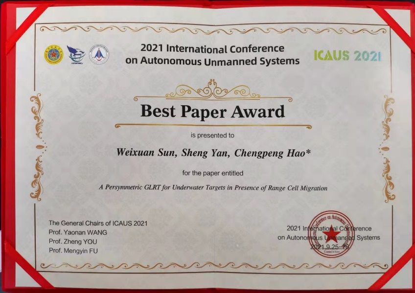 2021年9月25日至26日,由国防科技大学、北京海鹰科技情报研究所联合国内优势单位主办的国际会议2021 International Conference on Autonomous Unmanned Systems (ICAUS 2021)在长沙顺利举行。中科院声学所水下航行器实验室硕士研究生孙苇轩在郝程鹏研究员指导下撰写的论文A Persymmetric GLRT for Underwater Targets in Presence of Range Cell Migration获得了2021年度最佳论文奖。