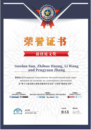 2021年10月15日至18日,由中国中文信息学会、中国计算机学会主办,江苏师范大学和北京工业大学承办的第十六届全国人机语音通讯会议(National Conference on Man-Machine Speech Communication, NCMMSC)在江苏徐州市顺利召开。声学所的中科院语言声学与内容理解重点实验室博士研究生孙国伦在张鹏远研究员指导下撰写的论文 Temporal Convolution Network Based Joint Optimization of Acoustic-to-Articulatory Inversion 获得了2021年度最佳论文奖。