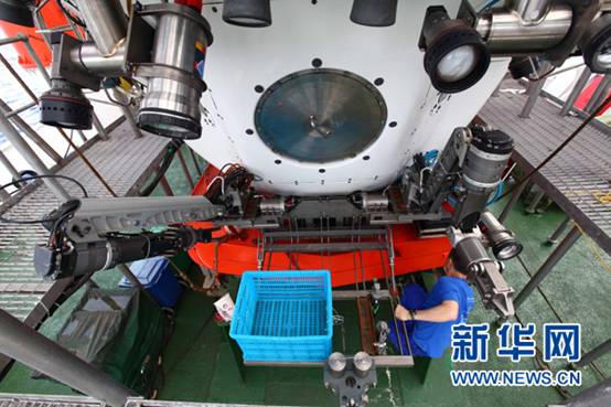 “蛟龙”号上安装的采样设备(6月14日摄)。当日,“蛟龙”号7000米级海试团队为潜水器安装上压载铁、采样篮等各种下潜所需的设备,为6月15日第一次下潜试验做好准备。受今年第四号热带风暴“古超”影响,试验海域海况仍然无法满足潜水器下潜条件,原定于6月14日进行的第一次下潜试验推迟至15日进行。新华社记者罗沙摄 |
