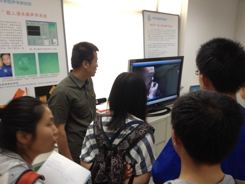 工作人員介紹“蛟龍號”載人潛水器聲學系統