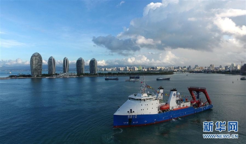 10月3日,搭载着“深海勇士”号载人潜水器的“探索一号”科考船在三亚港靠岸。新华社记者郭程摄